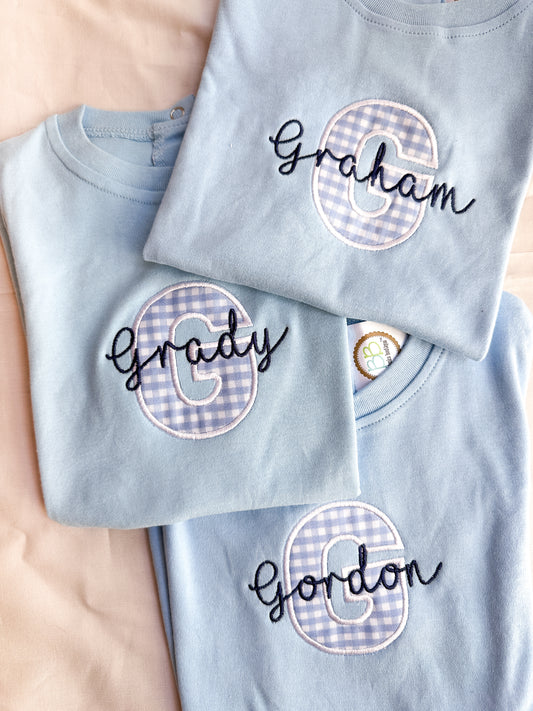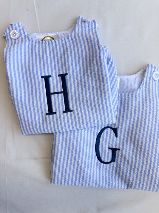 Personalized Initial Blue Seersucker Bubble Romper