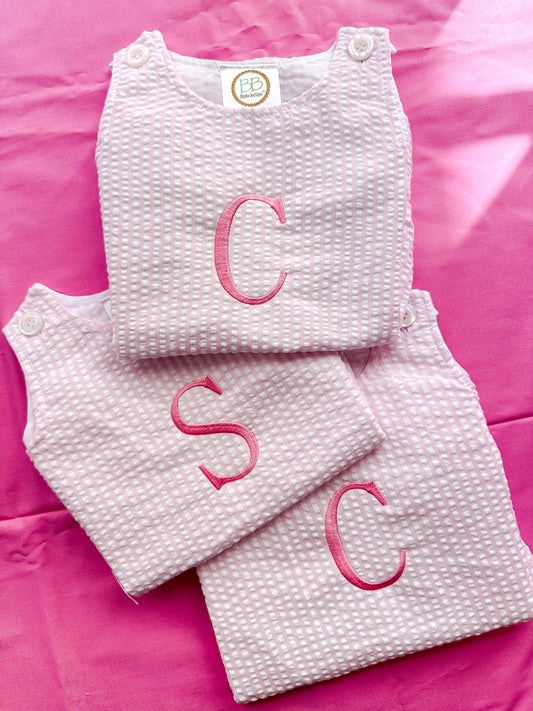 Personalized Initial Pink Seersucker Bubble Romper