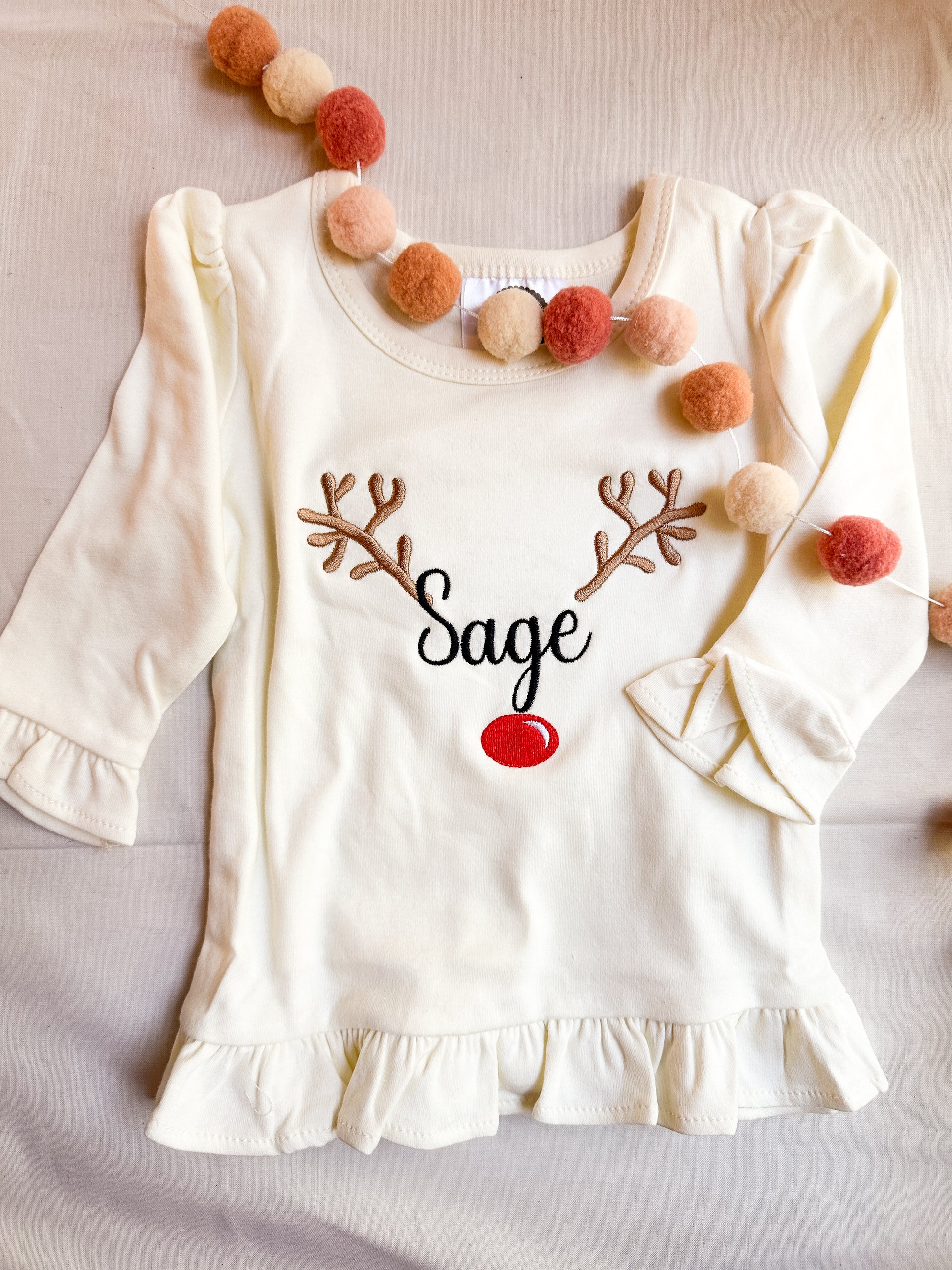 Get your little one ready for the holidays with our Personalized Reindeer Christmas Long sleeve! Featuring adorable embroidered reindeer antlers and a festive Rudolph nose, this soft cotton shirt is customized with your child's name for a truly special touch. Perfect for holiday photos or cozy Christmas mornings, it’s a fun and festive keepsake you'll treasure for years to come!