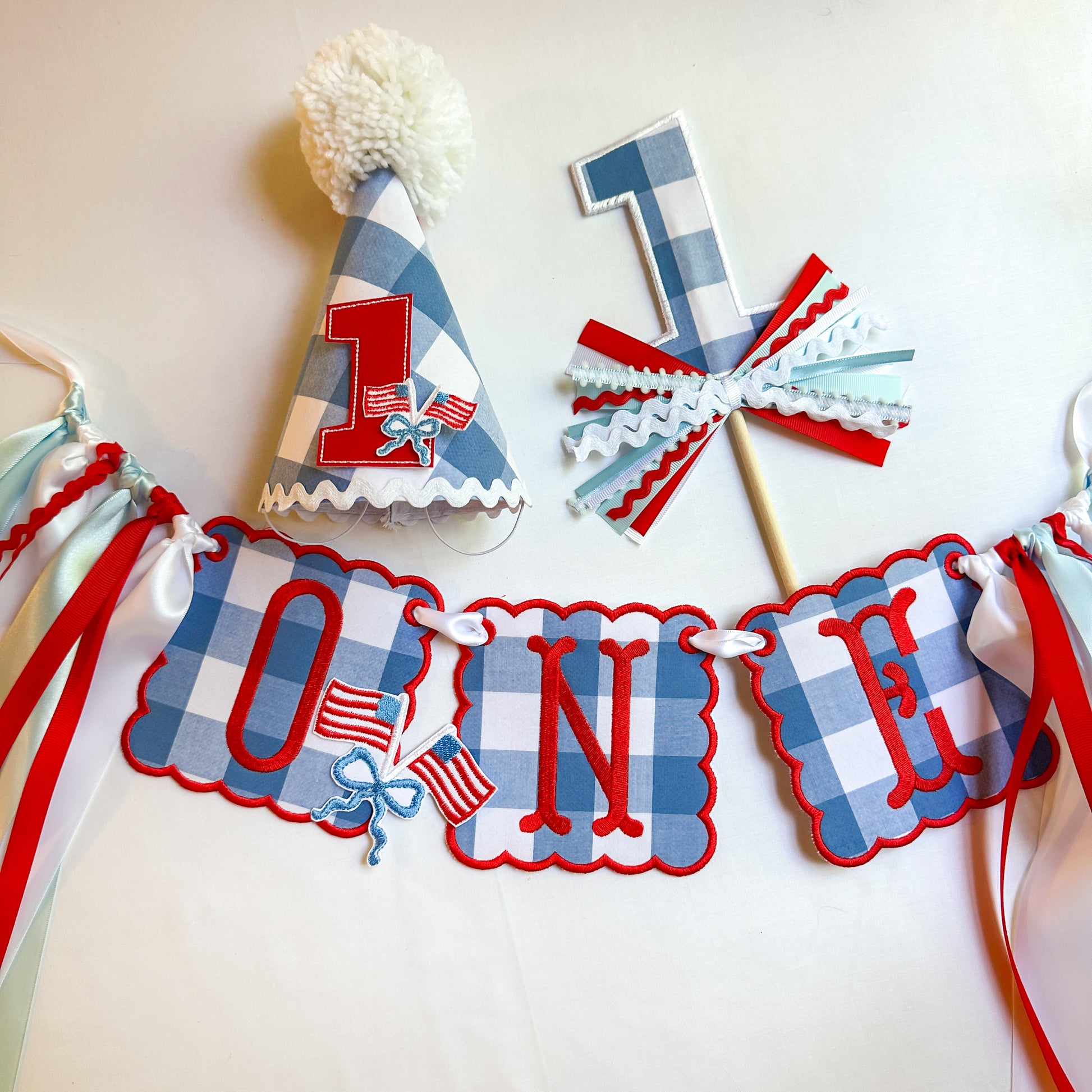 Your little firecracker is turning ONE! Celebrate with red, white, and so much cute in our All American Kid First Birthday Bundle – a festive 3-piece set perfect for summer babies, patriotic parties, and 4th of July birthday bashes. Featuring bold blue gingham, bright red embroidery, and classic Americana details like mini flags and ribbon bows, this coordinating bundle brings star-spangled style to your little one's milestone moment.
