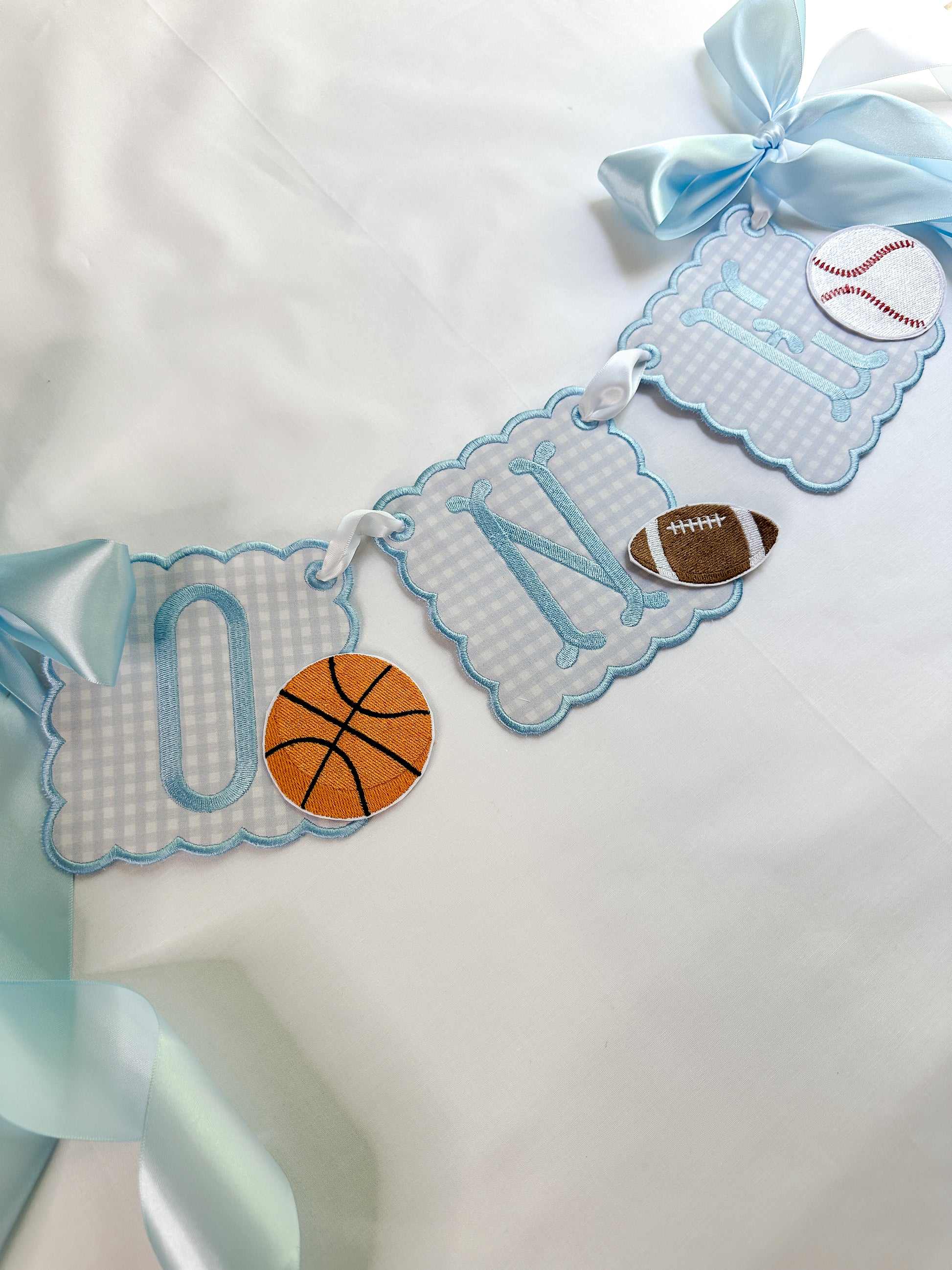 Celebrate your little all-star’s big day with our Rookie of the Year First Birthday Highchair Banner – the perfect finishing touch for a baby boy’s sports-themed first birthday party! Thoughtfully handmade with soft blue gingham fabric and scalloped edges, this charming banner features embroidered letters spelling out "ONE" with sporty stitched accents: a basketball, football, and baseball – making it an adorable keepsake for your future MVP.